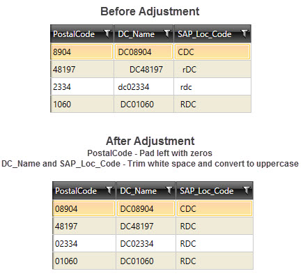 - For DC_Name and SAP_Loc_Code, trim white space and convert to uppercase.