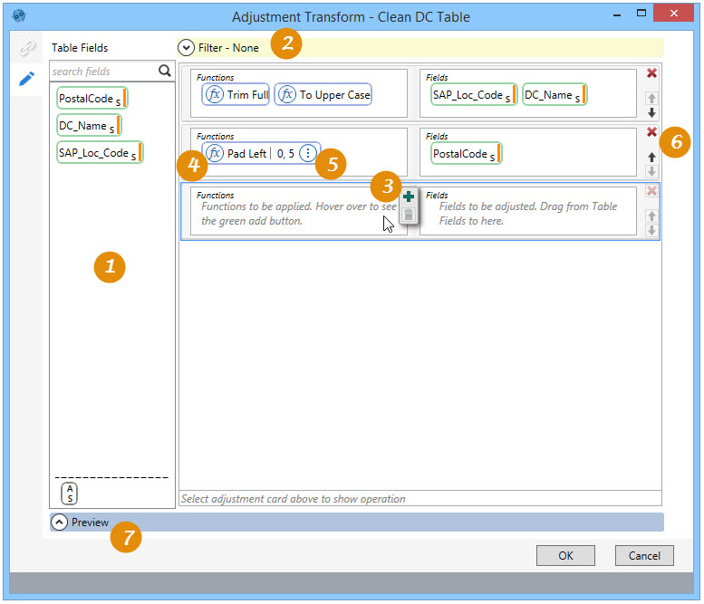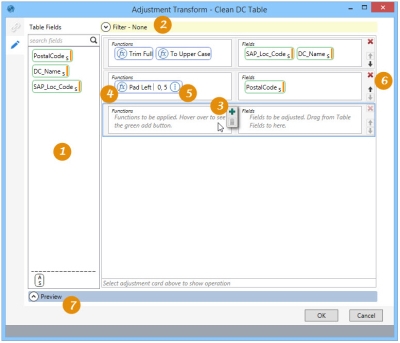 - Drag the icon of a field being adjusted from Table Fields into the Fields area on the right. If more than one field is being adjusted using the same function(s), drag the additional field(s) into the same Fields area.