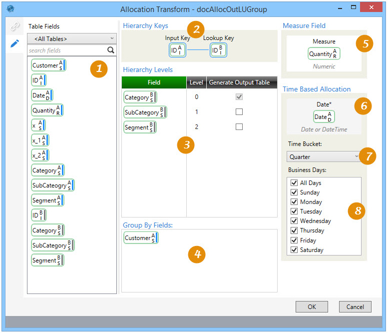 - For Time Based Allocation, drag from Table Fields to identify the Date field of the input table, then choose the Time Bucket increments to which data is to be aggregated, and select the Business Days for which data is to be aggregated.