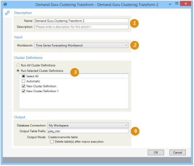 action allows you to run cluster definitions created in Demand Guru’s Time Series Forecasting Workbench, and save the output data generated from the cluster definitions.