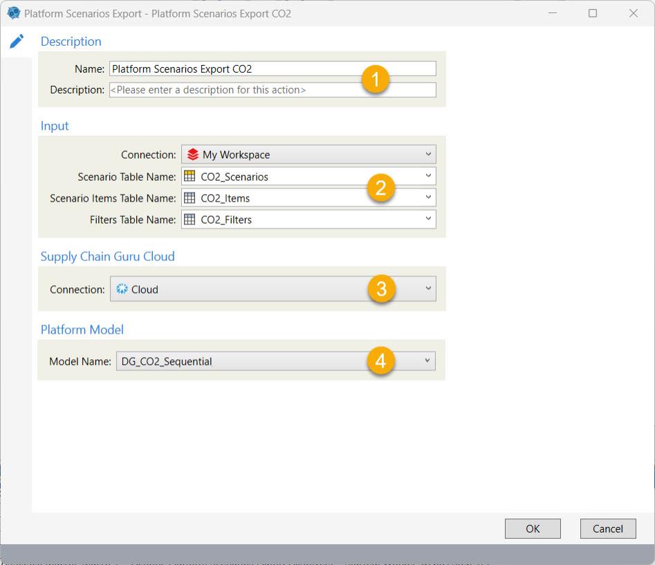 action allows you to export and upload model scenarios from local database tables to a Supply Chain Guru model on the Supply Chain platform. Before using this action, you must create a Supply Chain Guru Cloud connection of type Coupa Supply Chain.