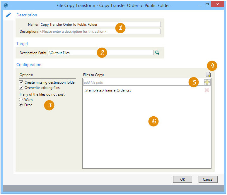 , enter a Name and a Description to identify this action, then specify a target and configuration options:- For Destination Path, enter or select the folder to which the file(s) will be copied.