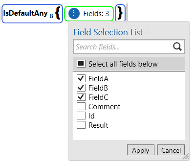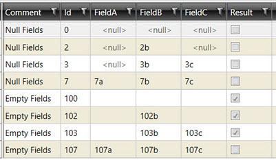 Determine if any of the fields (FieldA, FieldB, FieldC) have the database-specific empty string default value.