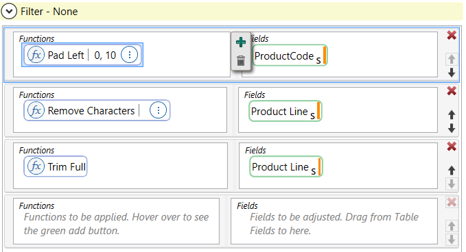 - In the first Functions card, use the Pad Left function to add zeros to the beginning of every ProductCode that contains less than 10 characters, until the code contains ten characters.