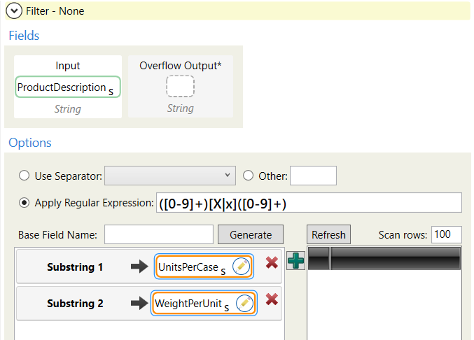 In the ProductDescription column, notice the two numbers contained within the strings of text. They represent the number of units per case and the weight per unit of each product. We need these numbers extracted from the ProductDescription column. To do this, we can identify a pattern in the ProductDescription column and apply a regular expression in the Text Parsing transform.