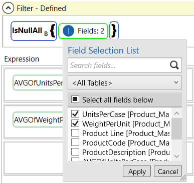 - On the Configuration tab, use the IsNullAll function to specify only the records with no value in the UnitsPerCase and WeightPerUnit columns.