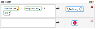 - On the Configuration tab, specify an expression to create a KgPerCase field, which is generated by multiplying UnitsPerCase by WeightPerUnit and dividing by 1000 (from grams to kilograms).