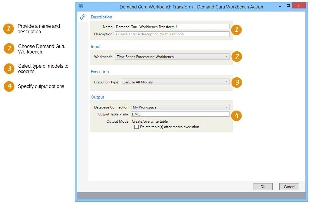 When you use Demand Guru to develop demand models for forecasting, the model associations and causal variables you define are saved for each demand time series. However, the output generated when you run those models in Demand Guru is only in memory and therefore not saved. Use Data Guru's Demand Guru Workbench action to run the model as configured in Demand Guru, and generate output that can be saved in Data Guru.