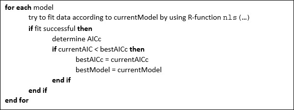 For a given data set, these three models’ parameters are estimated using R function nls(…). Depending on the data, fitting may or may not be successful. In case of unsuccessful data sets, we recommend that the modeler should increase the size of the data.