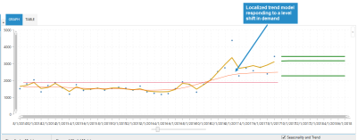 To overcome limitations associated with strictly assuming a parametric (or analytical) formula for estimating trend, Demand Guru utilizes a hybrid parametric/non-parametric model that can adapt to local changes in trend, while remaining sensitive to the presence of level shifts and other outliers present within the data. This hybrid approach automatically distinguishes between: