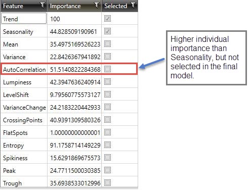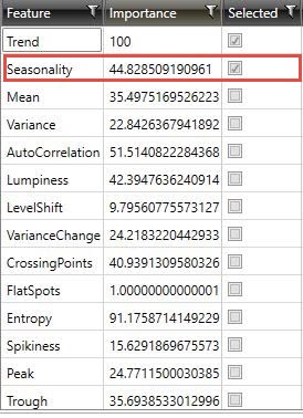 In the following example of an Automatic clustering model, Trend and Seasonality are the selected features, and Trend is the most important feature on its own relative to the others. AutoCorrelation, despite having an individual importance higher than Seasonality, is not selected in the final model - indicating that the combination of the best feature (Trend) with Seasonality (3rd best feature on its own) provides better clustering results than with any AutoCorrelation (2nd best feature).