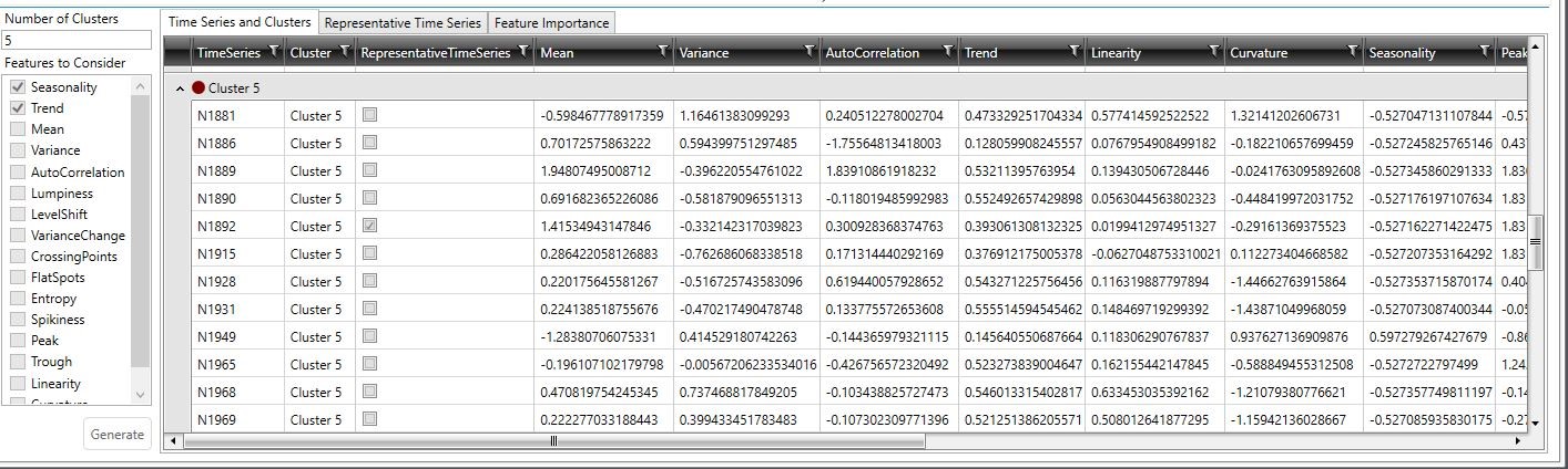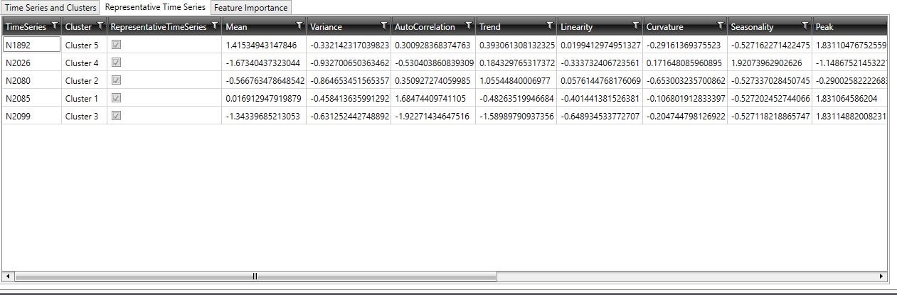 This table contains the same columns as the Time Series and Clusters table; however, only the time series that are identified as representatives of a cluster are listed, along with their feature scores.