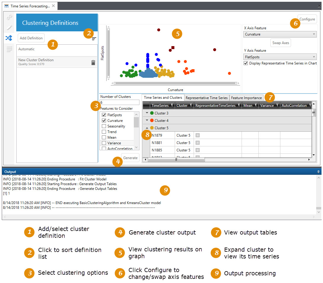 Once you have generated your time series, use the Clustering tab on the workbench to configure cluster definitions that group those time series based on a set of available attributes. You can customize copies of the default cluster definition generated when the time series are generated, or you can create new clusters. You must select Generate Time Series Only on the Definition tab of the workbench before you can configure clusters. Clustering can be performed with a minimum of 6 non-intermittent time series that each contain more than 10 data points.