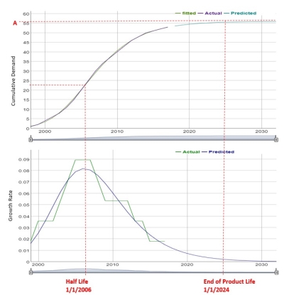 In this example, the product’s half-life 9 years in 2006, which is the point at which the growth rate starts to decline. The product life is estimated at 27 years, which in this case lasts until the end of year 2024. The total cumulative growth in the half-life is estimated at 24.6. Max growth, half-life, and product life are depicted in the following plot: