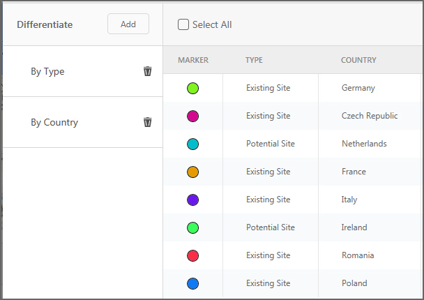 • Categorize – Unique marker colors (and optionally other characteristics) are assigned based on the value of the field you select. You can select one or more Categorize fields to uniquely identify map markers.