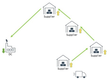 In addition, you can set up "floating assets" where the assets are not assigned to a specific site. This enables you to model the behavior of 3PL (third party logistics providers) vehicles where assets are not assigned to a domicile. This feature is primarily useful for inbound and interleaved models. In these cases, assets can start routes from any location in the model, such as a supplier on a multi-stop inbound route to a DC.