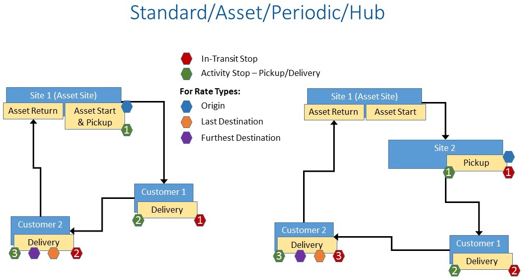 The following illustrations show how stops are evaluated, for in-transit and activity stops, as well as the stop classifications for rate types. In the first graphic, you see the stops for standard optimization, asset optimization, periodic optimization and hub optimization: