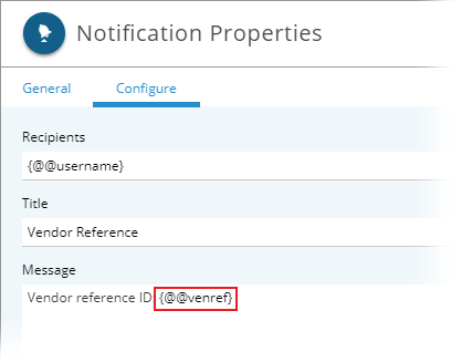 - On the Configure tab, specify the global variable for any property that acts upon the processed data. Enclose the variable in curly brackets. For example, "{@@venref}".