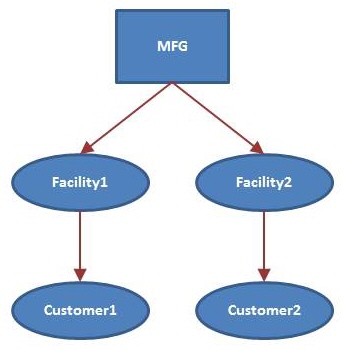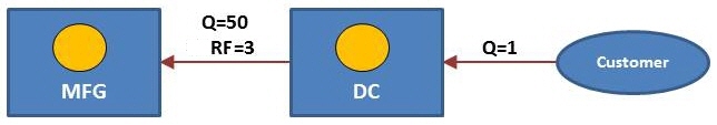 The main assumption with demand propagation is that each site operates under a continuous review policy (r, nq). Each site may place a replenishment order at any time. However, some sites may want to order at specific intervals. You can use Replenishment Frequency as an input to demand series-based demand propagation. Assume the network structure shown below, where Replenishment Frequency is set to 3 day for the DC. This setup means that the DC places orders to the MFG site every 3 days. In addition, the minimum order quantity is 50: