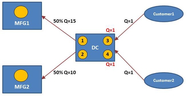 Customers place orders to the DC with Q=1. The fractional sourcing parameter at the DC is given as 50%. The DC places orders to MFG1 with Q=15 and orders to MFG2 with Q=10. The customer orders are: