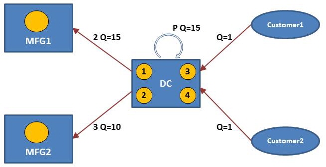 Component1 is produced at MFG1 and Component2 is produced at MFG2. The DC places orders to MFG1 with Q=15 and order to MFG2 with Q=10. The customer orders are: