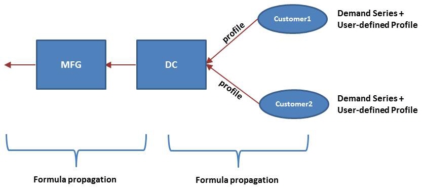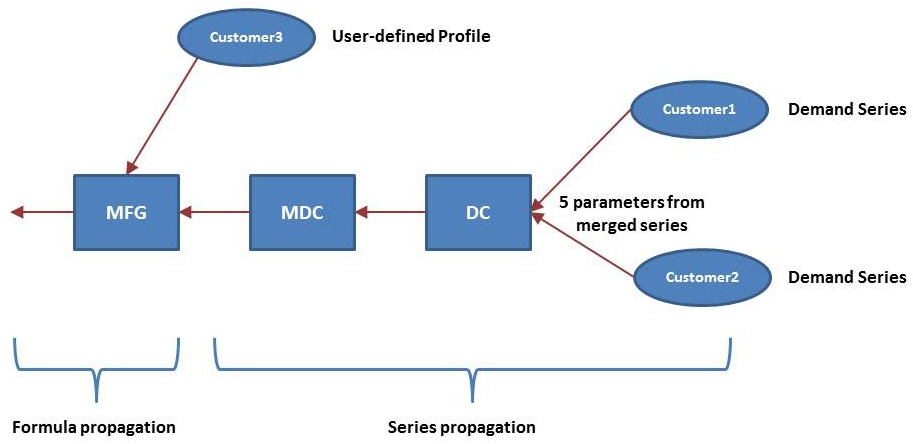 Assume that demand series-based demand propagation is selected. The demand information for Customer3 is available as demand statistics in the user defined forecast profile table. In this case, Demand Analysis performs demand series-based demand propagation from the customers to the MFG. From the MFG to upstream echelons, demand propagation is switched to formula-based demand propagation.