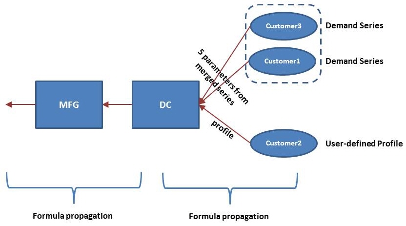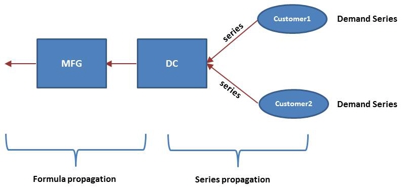 When the demand series are available at the customer level, demand series-based propagation is applied from customers to the DC even if you select the formula-based demand propagation method.