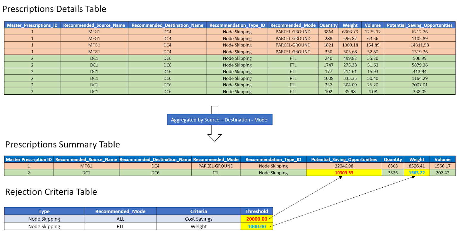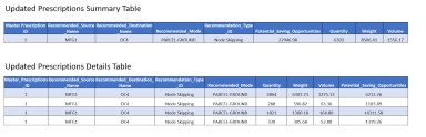 For the second prescription in the Prescription Summary table, the recommended mode is “FTL” and must satisfy both the thresholds (Weight for FTL as mode and Cost Savings across all modes) to be accepted. The second prescription satisfies the condition of minimum weight greater than 1000 lbs., but it fails to meet the minimum cost savings threshold of $20,000. Hence, this aggregated prescription is removed from the Prescriptions Summary table and its corresponding prescriptions from Prescriptions Detail Table.