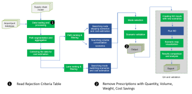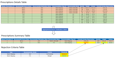 To compare the cost savings, quantity, volume, and weight, the scenarios must be validated and aggregated by Source-Destination-Mode. Once aggregated, the values are compared against thresholds (see ‘2’ in the figure above). Once the scenarios for each prescription type (Node Skipping, Mode Switching, and Volume Consolidation) are validated, the output tables are generated.